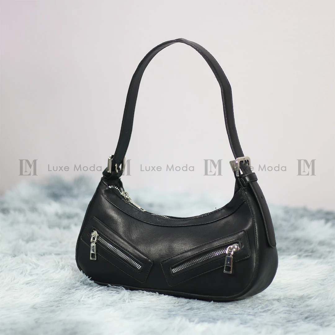Black PU leather shoulder bag with modern punk style and practical shoulder design. The Y2K bag effortlessly switches from a stylish shoulder design to a trendy crossbody look.